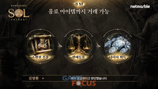 비즈니스 모델 측면에서도 기존 MMORPG들과 다른, 틀을 깨는 시도가 이뤄진다. '솔'에는 '갓 아머', '영체', 장신구 등 유료 아이템이 존재하며, 넷마블은 이러한 유료 아이템의 개인 간 거래를 전면 허용하기로 결정했다.