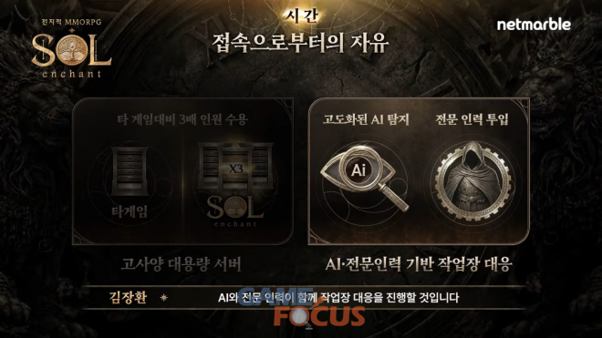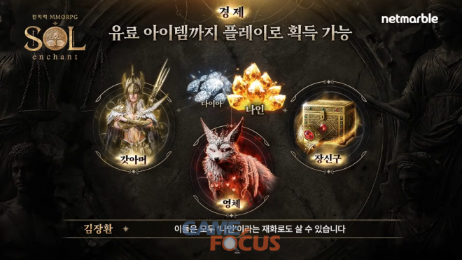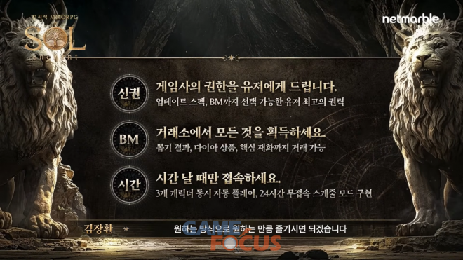 12일 저녁 공개된 '솔'의 온라인 쇼케이스에는 넷마블 김장환 사업부장, 알트나인 김효수 개발PD가 출연해 게임의 개발 방향성과 주요 콘텐츠, 그리고 차별화 요소와 비즈니스 모델 등 게임의 정보들에 대해 자세히 소개했다.