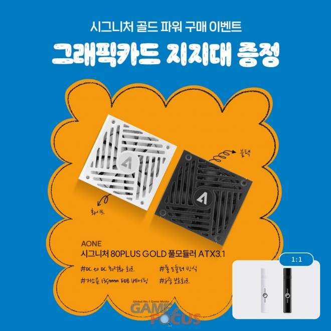 행사 대상 제품은 AONE 시그니처 골드 시리즈 전 라인업으로, 750W, 850W, 1000W, 1300W 출력 구간의 블랙 및 화이트 모델이 모두 포함된다. 구매 시 모델 및 색상에 따라 GH-1 블랙 또는 화이트 제품이 증정된다.