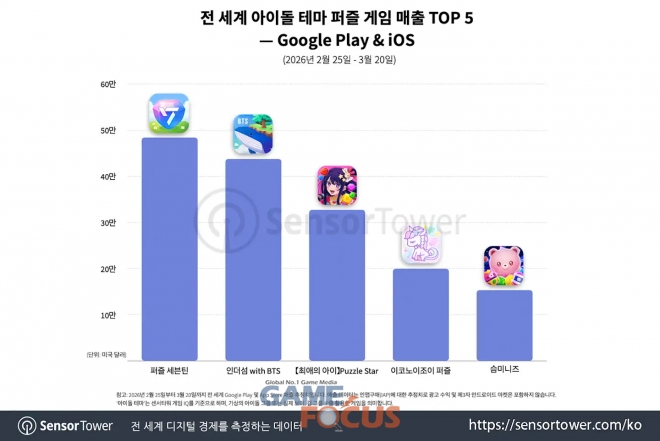 매출 기준으로는 전 세계 5위를 기록했습니다. 상위 5개 게임 중 3개가 한국 게임으로 나타나며, 아이돌 기반 퍼즐 게임 시장에서 한국 게임사의 경쟁력이 확인된다.