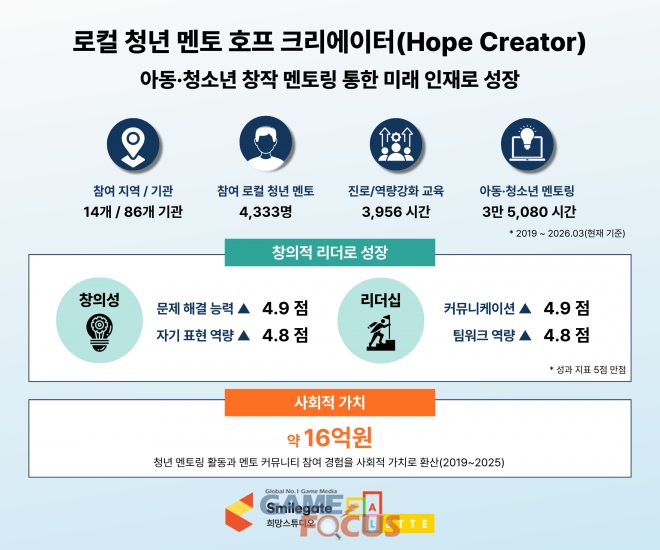 미래세대에게 희망을 확산하는 스마일게이트 희망스튜디오(이하 희망스튜디오, 이사장 권혁빈)는 창의 커뮤니티 ‘팔레트(PALETTE)’의 청년 멘토 ‘호프 크리에이터(Hope Creator) 6기’가 활동을 마쳤다고 27일 밝혔다.