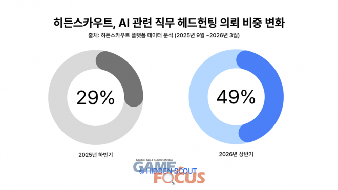 히든스카우트(대표 방현배)가 자사 플랫폼 내 헤드헌팅 채용 의뢰 기업의 데이터를 분석한 결과, AI 관련 직무 채용 의뢰 비중이 지난 6개월 사이 29%에서 49%로 크게 늘어난 것으로 나타났다. 전체 헤드헌팅 채용 의뢰 두 건 중 한 건이 AI 직무를 포함한 셈이다.