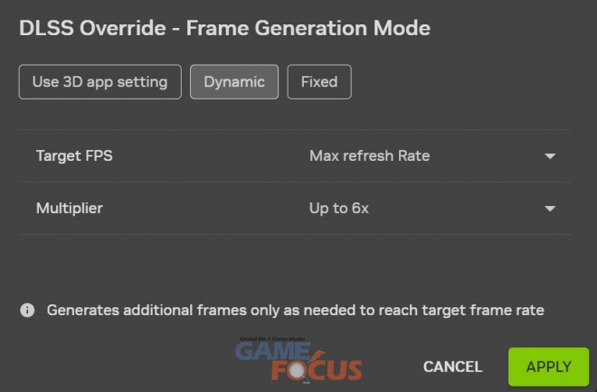 DLSS 4.5 다이내믹 멀티 프레임 생성 도입으로 엔비디아 앱 사용자는 이제 ‘다이내믹’ 멀티 프레임 생성과 ‘고정(Fixed)’ 멀티 프레임 생성 중 하나를 선택해야 한다.