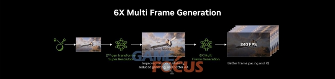 지포스 RTX 50 시리즈 GPU에서 4배 멀티 프레임 생성을 6배로 전환하면, 패스 트레이싱 지원 게임에서 4K 프레임 속도가 최대 35% 증가한다. 또한 새로운 고효율 프레임 생성 모델과 엔비디아 리플렉스(Reflex)의 저지연 기술을 결합해 추가 프레임 생성 시 반응성에 미치는 영향을 최소화한다.
