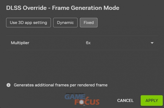 전체 또는 게임별로 ‘DLSS 오버라이드 – 프레임 생성 모드’를 열고 ‘고정’을 선택한 뒤 원하는 프레임 생성 배율을 선택하면 된다.