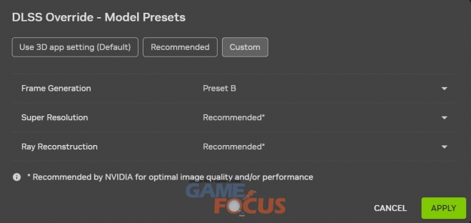 신규 모델을 지원 게임에서 활성화하려면 전체 또는 게임별로 ‘DLSS 오버라이드 – 모델 프리셋(DLSS Override - Model Presets)’을 열고 ‘프레임 생성(Frame Generation)’ 메뉴에서 ‘프리셋 B(Preset B)’를 선택하면 된다.