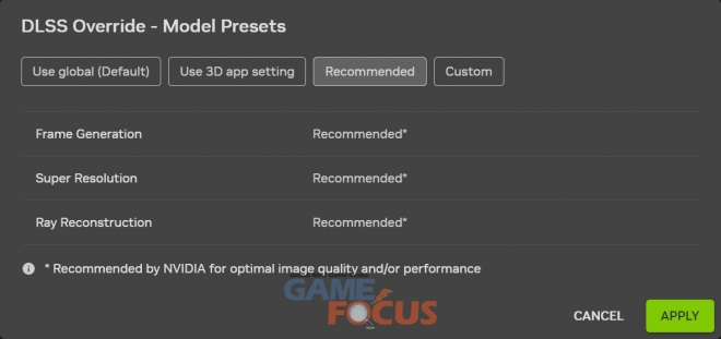 그래픽 탭에서 ‘DLSS 오버라이드 – 모델 프리셋’을 선택한 뒤 ‘권장(Recommended)’을 선택하면 프리셋 M은 DLSS 퍼포먼스 모드, 프리셋 L은 DLSS 울트라 퍼포먼스 모드, 프리셋 K는 나머지 모드에 적용된다. 해당 설정을 변경하려면 메뉴에서 프리셋 L 또는 M을 선택해 모든 DLSS 모드에 동일한 프리셋을 적용하면 된다.