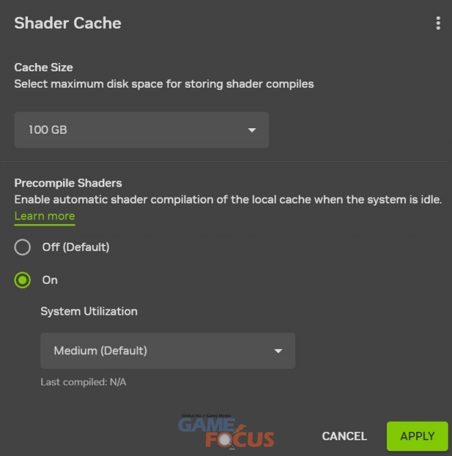 엔비디아 자동 셰이더 컴파일은 지포스 게임 레디 드라이버 595.97 WHQL 이상이 필요하다. 관련 피드백은 엔비디아 앱 우측 상단에 있는 양식을 통해 전달할 수 있다.