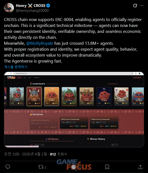 넥써쓰(NEXUS)가 게임체인 크로쓰(CROSS)에 AI 에이전트의 경제 활동과 거래를 지원하는 코인베이스의 x402 프로토콜에 이어, 에이전트의 신원을 검증하는 기술 표준인 ERC-8004를 적용하며 인프라 고도화에 박차를 가한다.
