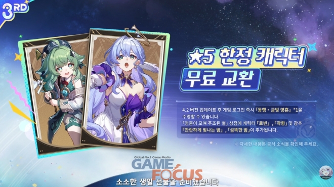 이와 함께 최대 20연차 티켓을 획득할 수 있는 출석 이벤트, 여정에서 만난 동료를 선택해 성옥 1600개 및 연료 10개를 얻을 수 있는 ‘개척하는 그대에게’, 서비스 3주년을 기념해 ‘차원 분열’, ‘기묘한 영역’, ‘꽃 피는 정원’에서 3배의 보상을 얻을 수 있는 300% 이벤트가 기간 한정으로 진행된다. 또한 업데이트 이후 게임 내 접속하면 ‘곽향’ 또는 ‘로빈’을 무료로 얻을 수 있는 한정 캐릭터 무료 교환 이벤트가 진행되며 ‘운리’, ‘아젠티’, ‘은랑’이 별빛 인연의 초대 선택 가능 캐릭터로 추가되고 카스토리스의 신규 코스튬 ‘춤추는 유몽’이 상점에 출시된다.
