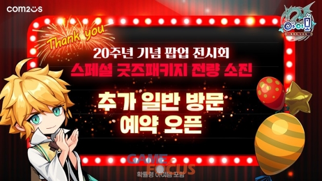 컴투스는 전시회에 앞서 지난 14일 사전 예약을 진행했으며, 팬들의 뜨거운 관심 속에 2시간 만에 전 회차 조기 매진됐다. 1차 사전 예약자들에게는 전시회 방문 시 특별 제작된 한정판 아이템들로 구성된 ‘20주년 스페셜 굿즈 패키지’를 증정한다. 아울러 아쉽게 예약 기회를 놓친 유저들을 위해 별도의 현장 대기 없이 바로 입장 가능한 ‘네이버 추가 일반 방문 예약’을 현재 접수 중이다.