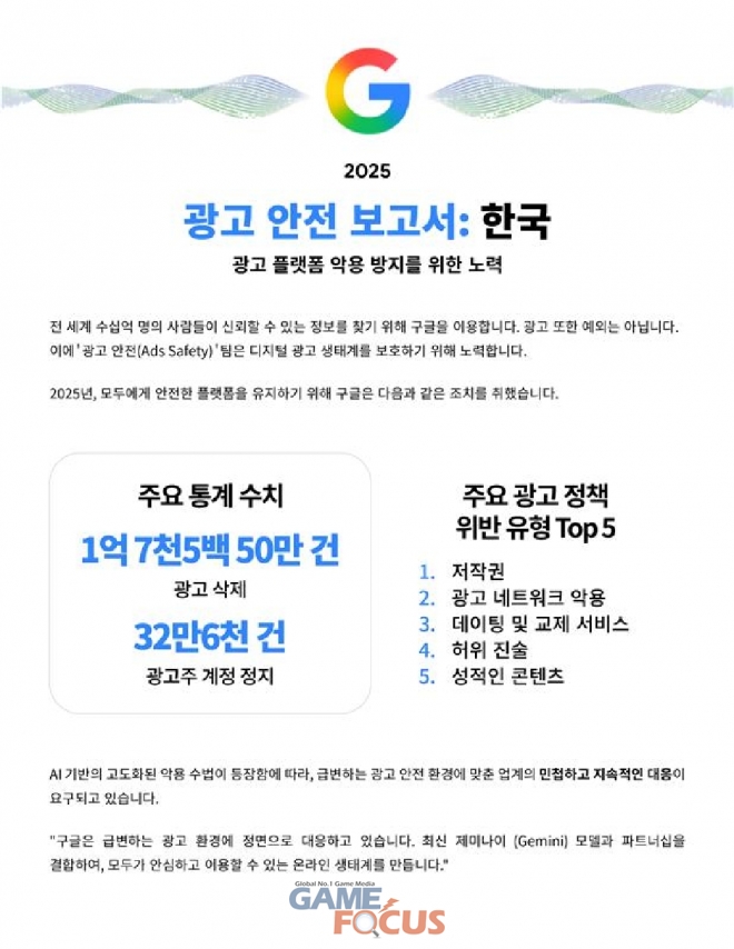 구글 관계자는 “AI 기술의 발전과 맞물려 끊임없이 변화하는 광고 안전 환경에 대응하기 위해 업계의 민첩한 움직임이 요구된다”며, “구글은 파트너들과의 긴밀한 협력과 최첨단 AI 기술을 활용해 이용자와 퍼블리셔 모두에게 보다 안전한 온라인 경험을 제공하기 위해 지속적으로 노력할것”이라고 밝혔다.