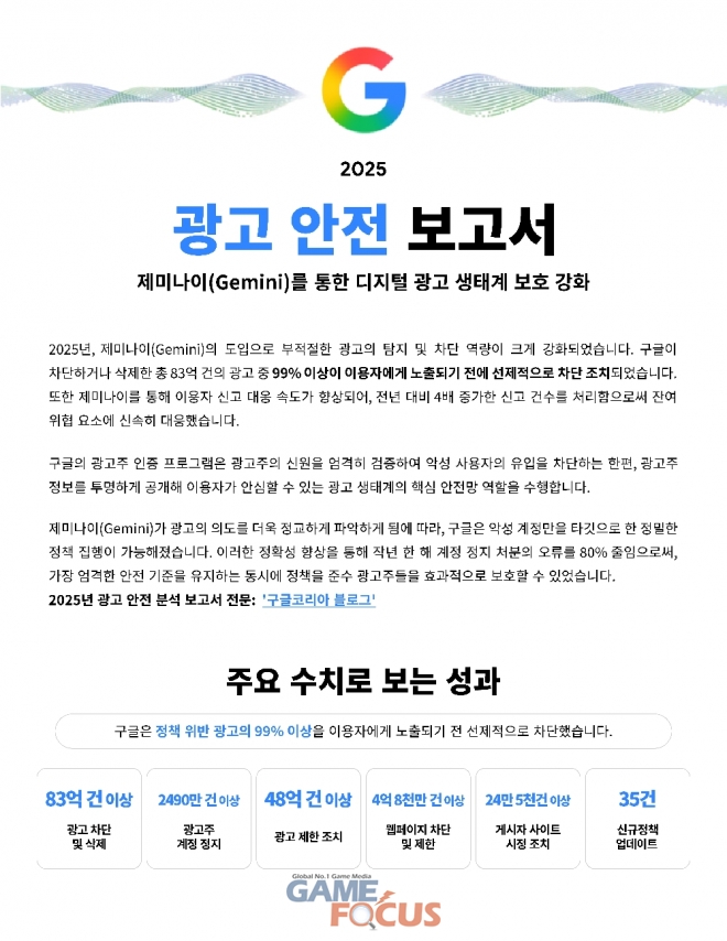 구글은 전 세계 수십억 명의 이용자에게 신뢰할 수 있는 광고 환경을 제공하기 위한 지난 한 해의 노력과 주요 성과가 담긴 ‘2025 광고 안전 보고서(Ads Safety Report 2025)’를 발표했다.