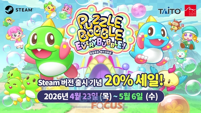 '퍼즐버블 에브리버블!'의 Steam 버전 출시를 기념해 23일부터 5월 6일까지 2주 동안 Steam에서 기간 한정 20% 특별 세일이 진행된다.