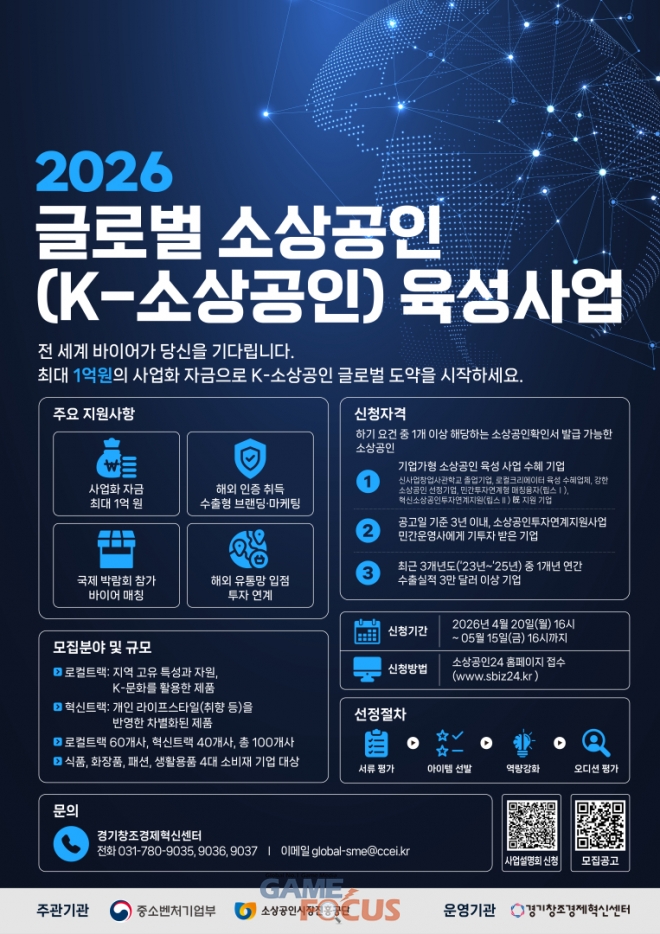 (재)경기창조경제혁신센터(대표 김원경, 이하 ‘경기혁신센터’)는 소상공인시장진흥공단과 함께 수출 잠재력을 보유한 소상공인의 글로벌 시장 진출을 지원하기 위한 ‘2026 글로벌 소상공인(K-소상공인) 육성사업’ 참여기업을 모집한다고 밝혔다.