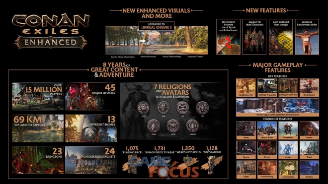 ‘코난 엑자일’ 스팀(Steam) 플레이어는 5월 5일(현지 시간) ‘코난 엑자일 인핸스드’로 자동 업그레이드할 수 있다. 기존 언리얼 엔진 4 버전은 스팀 라이브러리의 ‘속성(Properties)’ 메뉴를 통해 계속 이용할 수 있다. 업그레이드와 캐릭터, 기타 콘텐츠 이전 방법에 대한 자세한 내용은 ‘코난 엑자일 인핸스드’ FAQ에서 확인할 수 있다.