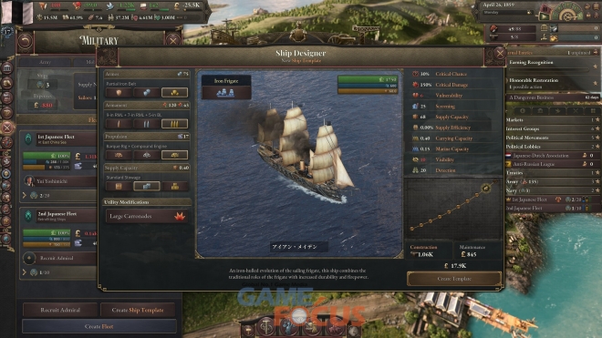 국가의 전략적 수요에 따라 함대를 설계하고 건조하라. 대양을 횡단하는 대양해군은 높은 비용이 요구되지만, 다른 국가에 영향력을 행사할 수 있는 강력한 투사 수단이다. 반면 연안해군은 연해 방어에 특화되어 있으며, 보다 효율적인 운용이 가능하다. 플레이어는 자신의 전략에 맞춘 군함을 설계할 수 있다.