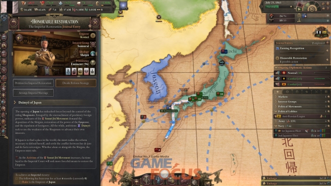 ●일본이 세계 무대에 등장할 수 있도록 서구 열강의 방식으로 이들을 압도하라. 해군을 활용해 일본의 영향력을 본토 너머로 확장하고, 강력한 이웃 국가들과 영토 및 영향력을 두고 경쟁하라.
