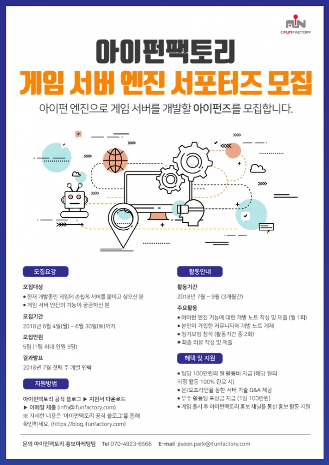 게임 서버 전문 기업 아이펀팩토리(대표 문대경)는 자사의 게임 서버 엔진을 사용해 게임 서버를 개발할 서포터즈를 모집한다고 4일 밝혔다.