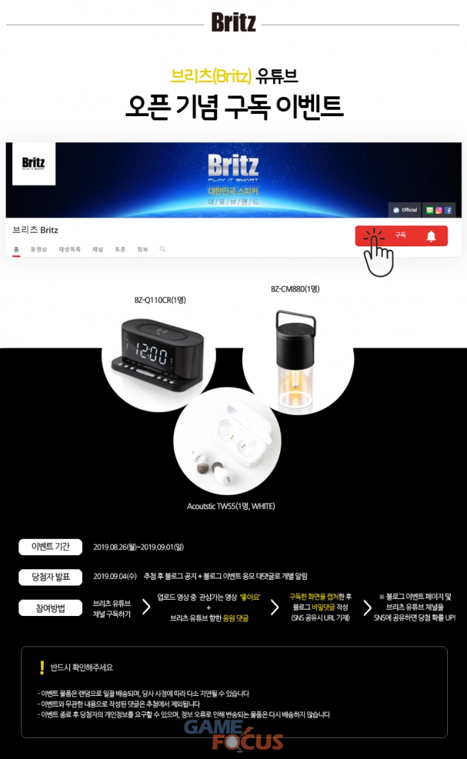 사운드 전문 기업 브리츠가 26일부터 오는 9월 1일까지 브리츠 공식 유튜브 채널 개설(을 기념해 구독 이벤트를 진행한다.