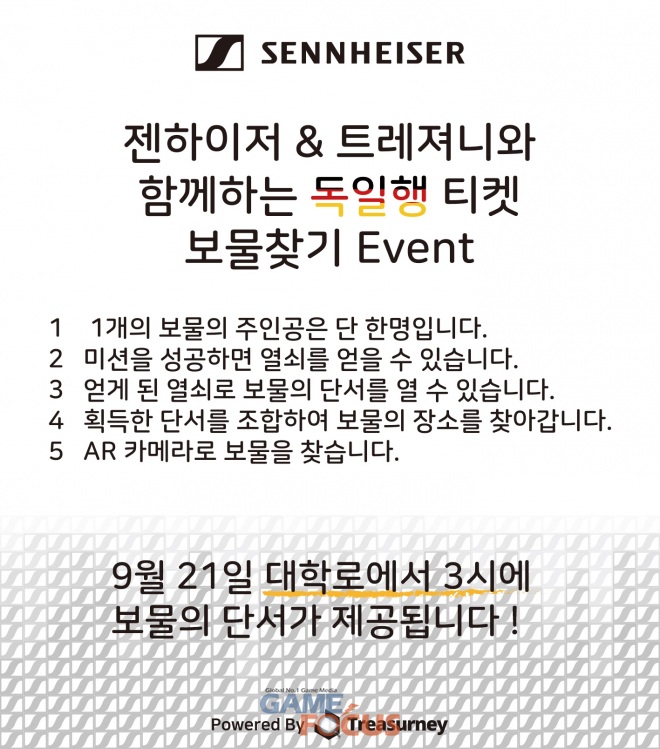 독일 오디오의 명가 젠하이저가 무선 헤드폰 '모멘텀 와이어리스3'의 출시를 기념해 증강현실(AR) 게임 '트래져니'와 함께 독일행 비행기 티켓이 포함된 다양한 경품을 증정하는 '독일행 보물찾기' 오프라인 이벤트를 진행한다.