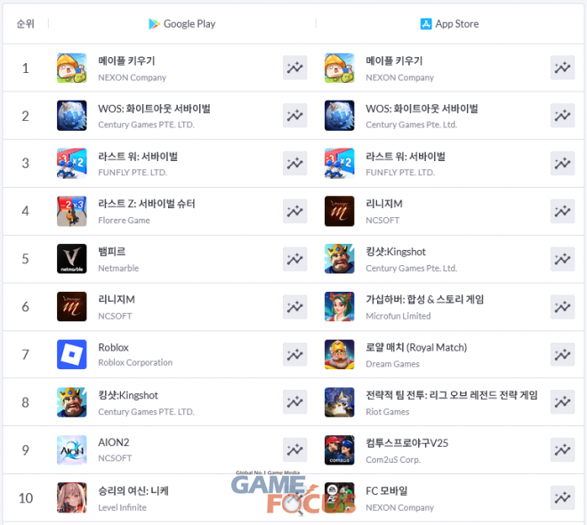 애플 앱스토어에서는 '메이플 키우기', '화이트아웃 서바이벌', '라스트 워: 서바이벌', '리니지M', '킹샷' 등이 TOP 5를 형성하고 있다. TOP 10 내에는 지난 주와 유사하게 '가십하버', '로얄 매치', '전략적 팀 전투', '컴투스프로야구V25', 'FC모바일' 등의 게임들이 이름을 올리고 있다.