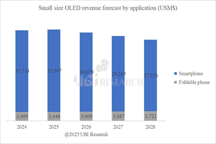 유비리서치가 최근 발간한 ‘2025 소형 OLED Display 연간 보고서’에 따르면 2024년 스마트폰과 폴더블폰용 OLED 출하량은 각각 8.34억대와 2천 4백만대로 집계...