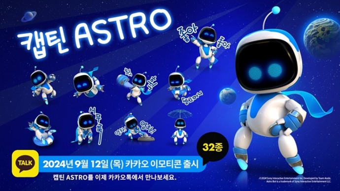 소니인터랙티브엔터테인먼트코리아(이하 SIEK)가 PlayStation®5(이하 PS5®)용 소프트웨어 ‘아스트로봇’ 발매를 기념한 ‘캡틴 ASTRO’ 카카오 이모티콘을 출...
