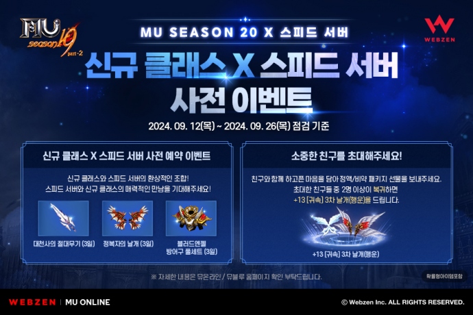 웹젠(대표 김태영)이 PC MMORPG ‘뮤 온라인’에서 시즌 20 업데이트를 앞두고 사전 이벤트를 진행한다. ‘뮤 온라인’은 오는 26일까지 신규 클래스와 스피드 ...