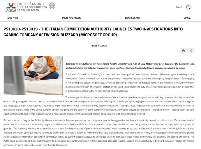 이탈리아 경쟁당국(이하 AGCM)이 현지시간으로 16일, 마이크로소프트의가 소유한 액티비전 블리자드가 서비스하는 ‘디아블로 이모탈’과 ‘콜 오브 듀티 모바일...