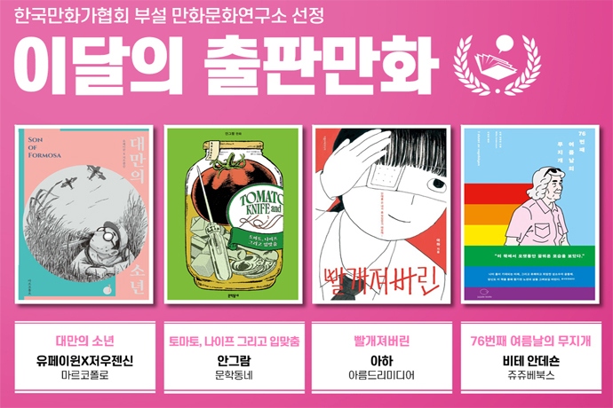 한국만화가협회 부설 만화문화연구소(이하 만화문화연구소)는 ‘8월 이달의 출판만화’로 《대만의 소년》, 《토마토, 나이프 그리고 입맞춤》, 《빨개져버린》,...