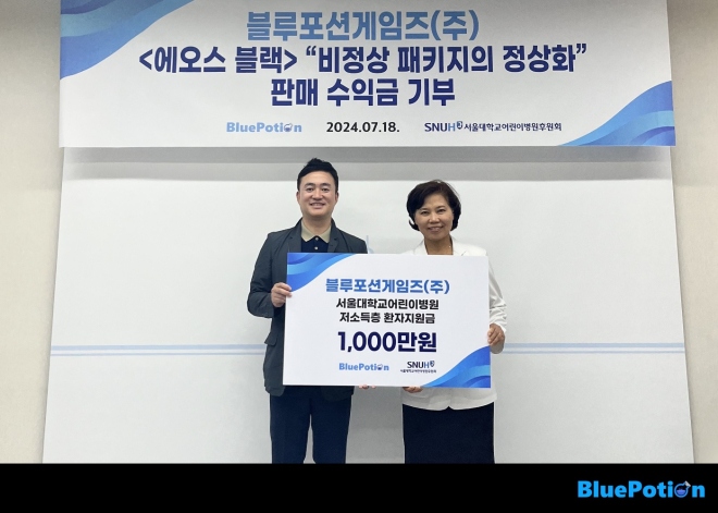 블루포션게임즈(대표 정재목, 조승진)는 자사의 최신 모바일 MMORPG '에오스 블랙' 1천 원 패키지의 수수료 제외 판매 수익금 1천만 원 전액을 서울대학교 어린...