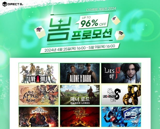 에이치투 인터렉티브(대표 허준하)는 자사의 디지털 유통 서비스인 다이렉트 게임즈에서 오늘(25일)부터 봄 프로모션을 비롯한 다양한 이벤트를 진행한다고 밝혔...