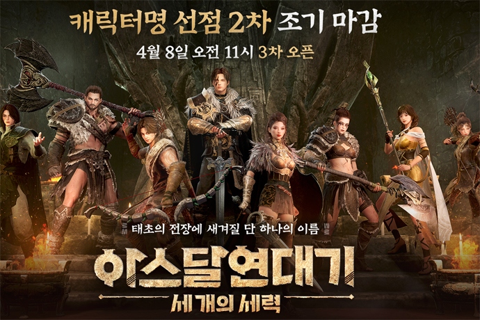 넷마블(대표 권영식, 김병규)은 신작 MMORPG <아스달 연대기: 세 개의 세력>(개발사 넷마블에프앤씨) 캐릭터명 선점 2차 이벤트가 마감됐다고 5일 밝혔다....