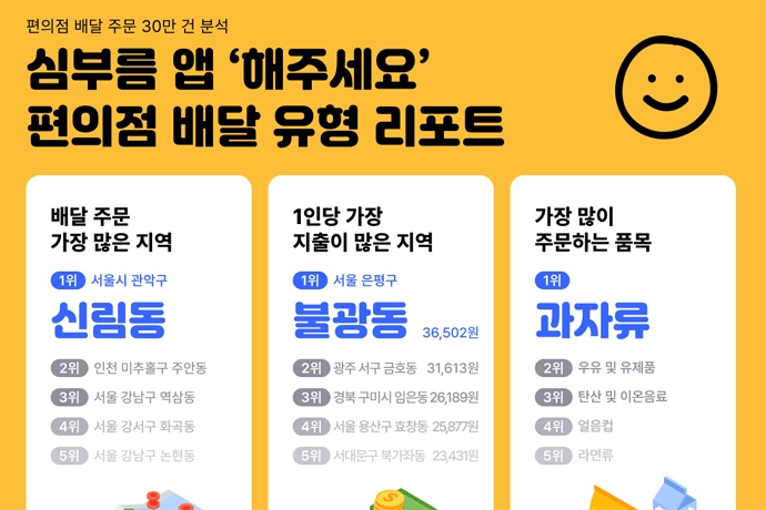 (주)하이퍼로컬(대표 조현영)이 운영하는 심부름 앱 '해주세요'는 편의점 배달 주문 30만건을 분석한 편의점 배달 유형 리포트를 27일 공개하면서 편의점 배달 ...