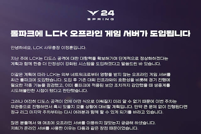 LCK가 금일(13일) '2024 LCK(리그 오브 레전드 챔피언스 코리아)' 스프링 시즌의 경기가 진행되는 롤파크에 외부 네트워크로부터 영향받지 않는 오프라인 게임 ...