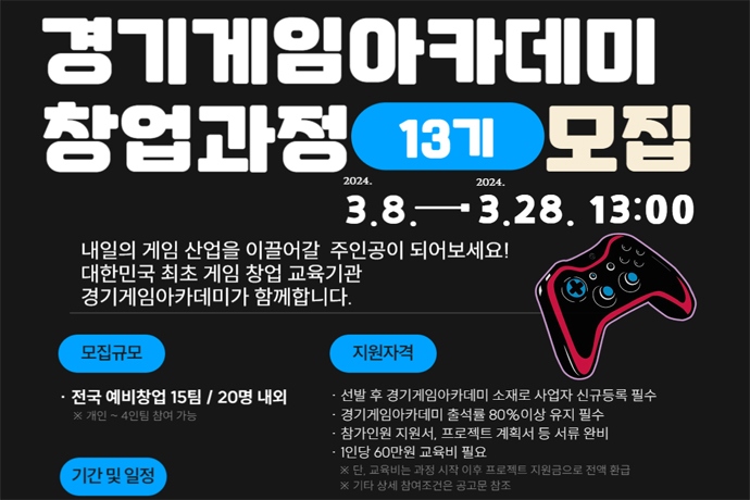 경기도와 경기콘텐츠진흥원이 '2024년 경기게임아카데미 창업과정 13기' 사업에 참여할 예비 게임창업팀을 오는 28일까지 모집한다. 경기게임아카데미는 판교 경...