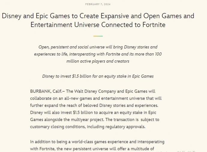 월트 디즈니 컴퍼니가 현지시간으로 7일, 공식 성명을 통해 새로운 게임 및 엔터테인먼트 분야 협력을 위해 에픽게임즈에 15억 달러(한화 약 2조 원)을 투자하고...