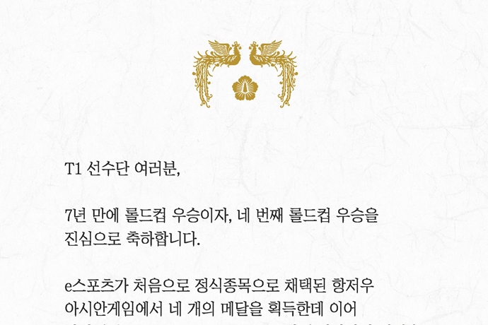 윤석열 대통령이 SNS 축전을 통해 '2023 리그 오브 레전드(LoL) 월드 챔피언십(2023 롤드컵)'에서 웨이보 게이밍을 꺾고 우승한 T1을 축하했다. 윤석열 대통령은...