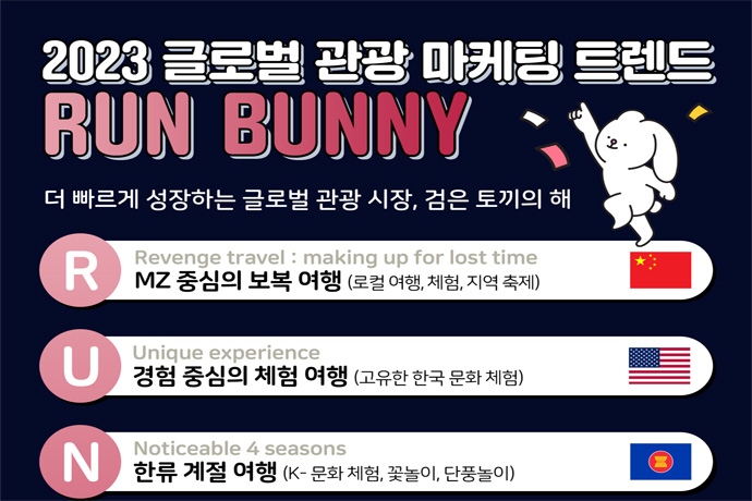 더에스엠씨그룹(대표 김용태)'의 관광 특화 조직 'IMK'가 2023 글로벌 관광마케팅 트렌드를 발표했다고 10일 밝혔다. 핵심 키워드로 'R.U.N B.U.N.N.Y'를 선정했...