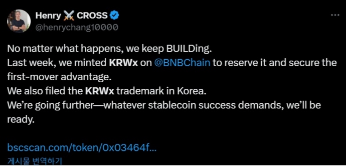넥써스(Nexus) 장현국 대표가 자체 스테이블코인 발행 계획을 밝힌 가운데 크로쓰 기반의 ‘KRWx’의 상표권 출원을 공식화 하며 본격적인 행보에 나섰다. 장 대...